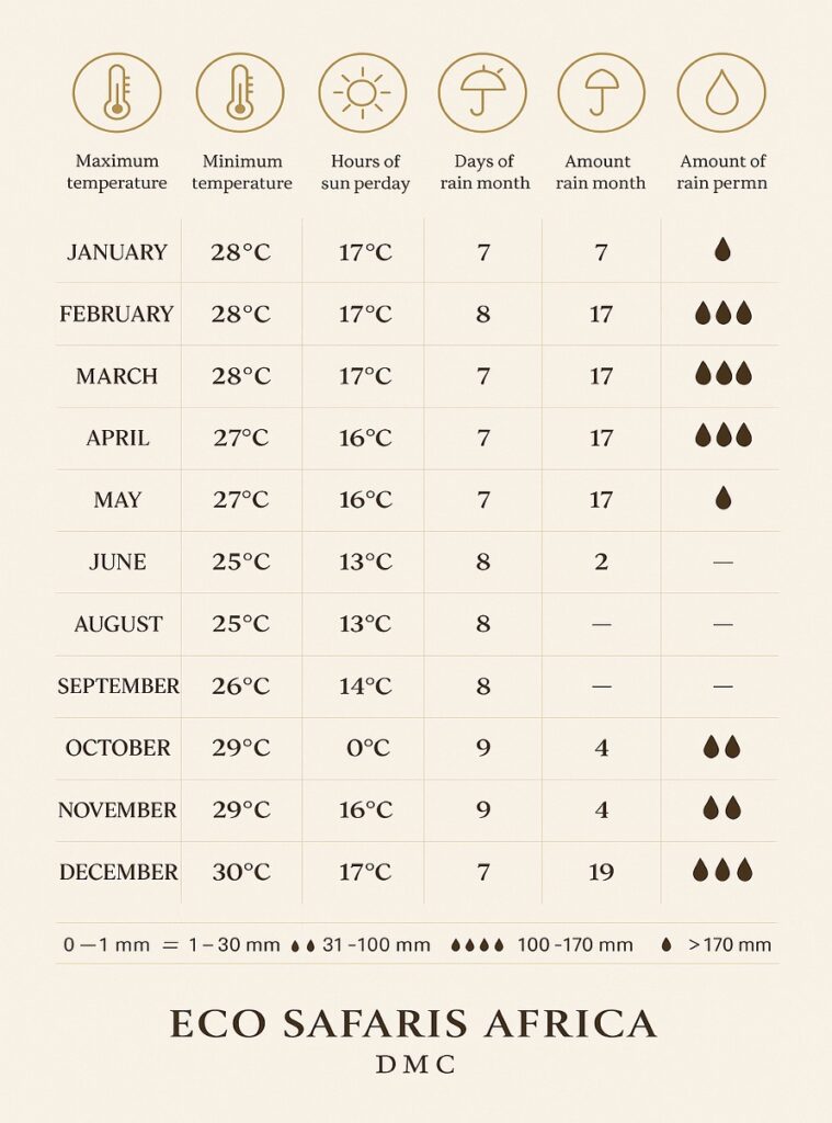 Tanzania’s weather changes a lot depending on where you are, but it’s always a great place to visit! The coast is hot and very humid, like a warm jungle, while the northern and highland areas are cooler because they are higher up. Temperatures usually stay between 22°C and 31°C. Zanzibar’s beaches have a warm and tropical feel all year round.